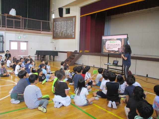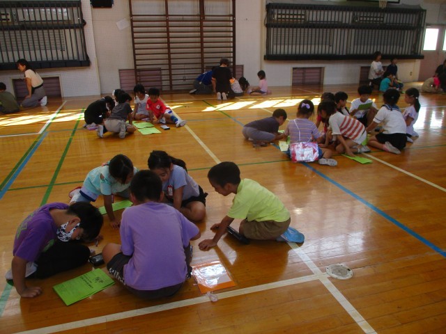 1.2年生活科見学に向けてのオリエンテーションをしました。しおりを読んで予定や約束、持ち物を確かめ、みんなで協力して動物をしっかり見てこようと意欲を高めました。また4月の遠足のときのグループで集まって、改めて自己紹介をしたり動物クイズに挑戦したり、2年生がリードしながら仲良く活動しました。