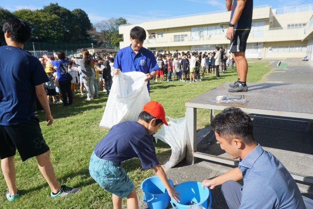 スローガン発表の後は、全校児童で校庭の小石を拾ったり、芝生の雑草を抜いたりしました。