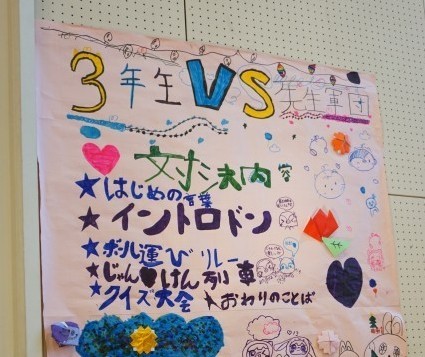 子供たちの団結力や協力する姿勢を高めるために、今回の学年集会は「3年生VS先生軍団」と題し、子供たちと先生たちが様々な企画で対決する楽しい催しとなりました。