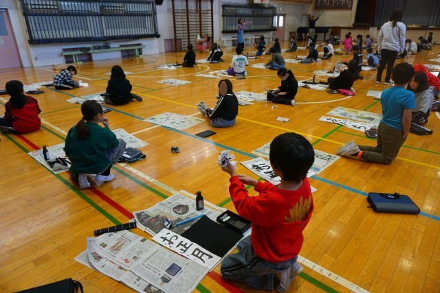 写真の3年生は、学年全員で体育館に集まって実施していました。お手本の「お正月」と「友だち」のどちらか一つを選び、一画一画丁寧に書いていました。(一画書いては深呼吸する子もいて緊張感が伝わってきました。)