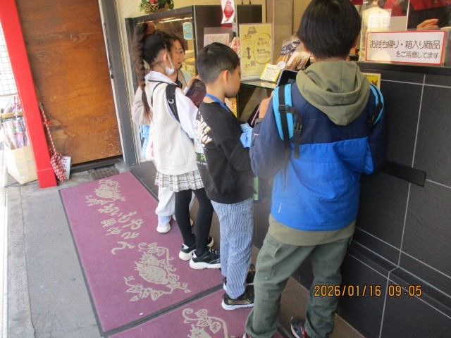 浅草雷門では、仲見世通りでお土産を買いました。浅草ならではの人や文化と触れ合うことができました。「人形焼を買えた!」「雷おこしを買った!」など、班のみんなで決めたお店に行くことができました。