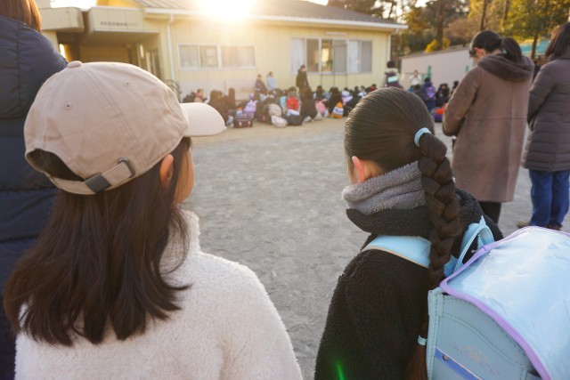 朝日とともに行った出発式では、今回の移動教室のめあて(スローガン)を全員で確認しました。今回のめあては、『6年生へ向けて! 協力と友情で楽しむ 思い出に残る二日間』です。出発式をしている5年生を見ながら、ふと周囲に目をやるとお見送りに来ていただいた多くの保護者の方々に紛れて下級生の児童の姿(2枚目の写真)も見られました。最後の5年生からの「行ってきまーす」に、保護者の方々、教職員、在校生みんなで「行ってらっしゃーい」を伝えました。めあての通り、無事故で思い出に残る二日間にしてもらいたいと思います。