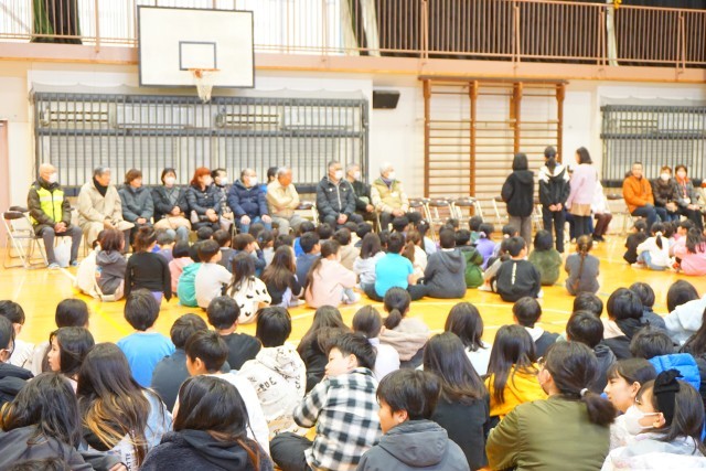 今朝、体育館にて登下校の見守りやゲストティーチャー、ボランティア等、日頃からお世話になっている地域の方々をお招きして感謝の気持ちをお伝えする「ありがとう集会」を実施しました。