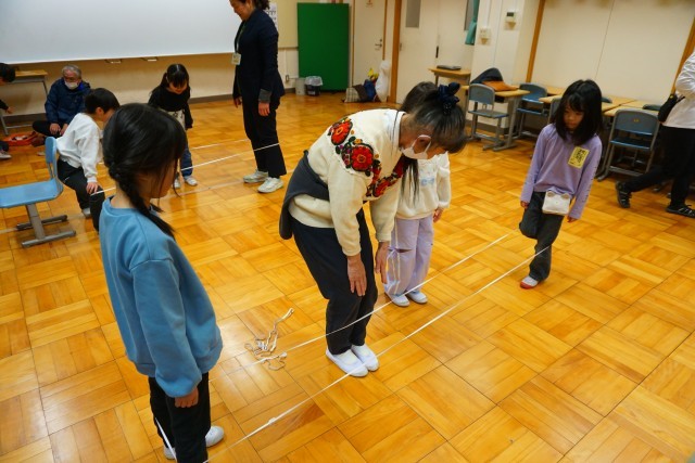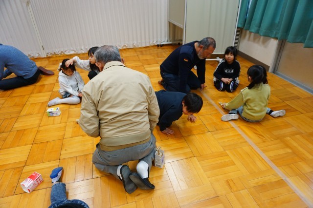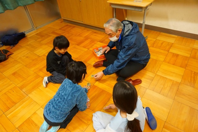 その後、お時間に都合のつく地域の方々に残っていただき、1年生と一緒に「昔遊び」を行っていただきました。“だるま落とし”や“ゴム跳び”、“めんこ”等、コツを教わりながら一緒に楽しく活動することができました。1年生の何人かに感想を聞いてみましたが、「楽しかったから、もっとやりたかった!」「いろいろ(やり方やコツを)教えてもらった。」と言っていました。