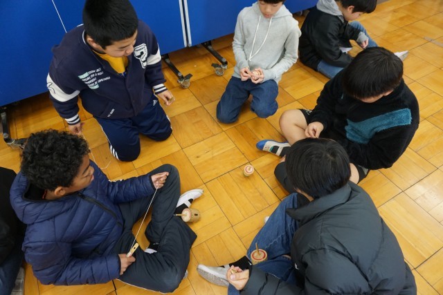 2/18(水)【6年生】世界の遊び「世界のコマの回し方」の様子 その1