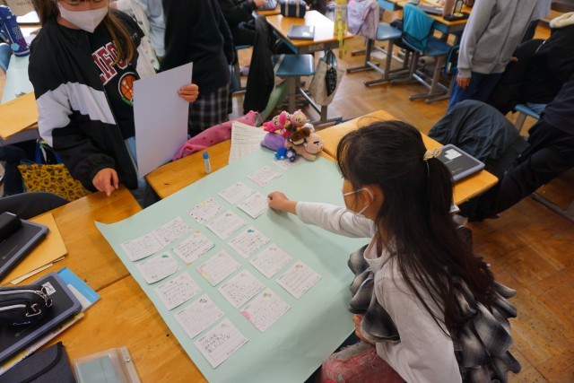 本日2時間目に5年生の教室をのぞいてみると、子供たちが色付きの模造紙を前に何やら作業をしていました。話を聞いてみると、先日このホームページでも紹介させてもらった「たてわり班活動」で、1~5年生が6年生に向けて書いた感謝のメッセージを、5年生が取りまとめて模造紙に貼っているところだというのです。自分たちを含め、下級生が書いた大切なメッセージです。貼る場所やバランスに注意しながら、協力して模造紙に貼り付けていました。今まで6年生が中心となって進めてきた「たてわり班活動」ですが、5年生への引継ぎが進んでいます。
