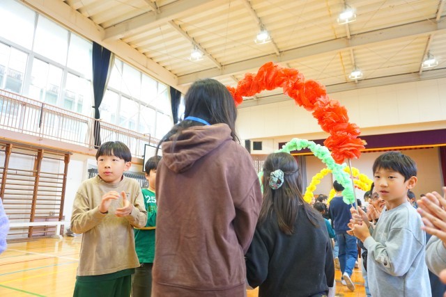 手作りの次第(プログラム)が光る中、主役の6年生が入場しました。入口で2年生が、これまた手作りの折り紙で作ったメダルを6年生の首にかけてあげました。2年生の身長に合わせて腰をかがめたり、しゃがんだりしている6年生の姿がなんとも微笑ましかったです。メダルをもらった後は、1年生と手をつないで花のアーチをくぐって入場しました。1年生と比べると背丈の違いが一目で分かります。6年生も1年生の時はきっと(今の1年生と)同じぐらいの背丈だったんだろうなと思うと感慨深いものがありました。