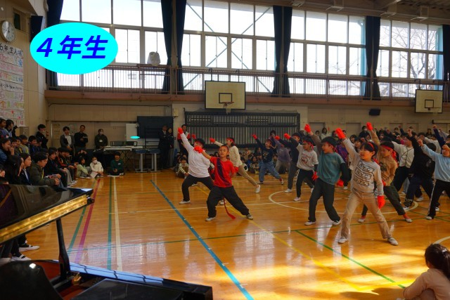 みどり学級の後に登場した4年生は、運動会の応援団になりきって6年生の活躍を振り返り、中学校進学に向けてエールを送りました。ハチマキを巻き軍手をはめた4年生が、応援団顔負けの大きな声で発表する姿がとてもかっこよかったです。