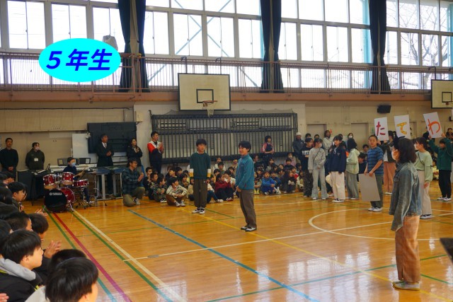 下級生の発表のトリを飾ったのは5年生。5年生は学校をリードしてきてくれた6年生への感謝と、最高学年としての責任を引き継ぐという決意をラップにのせて発表しました。ラップのビートを刻むためにドラムセットも登場し、盛り上がりました。