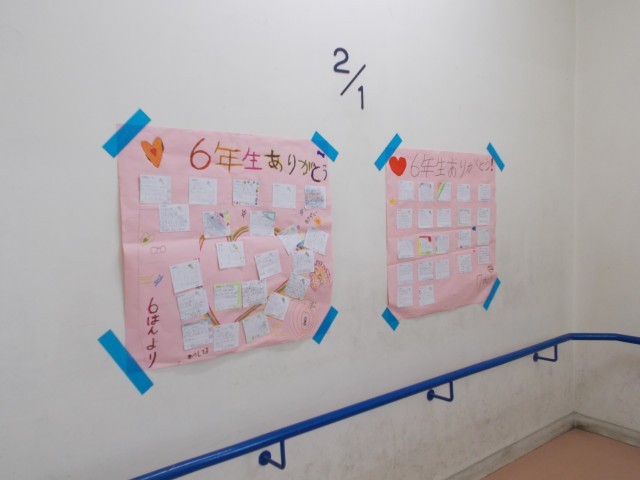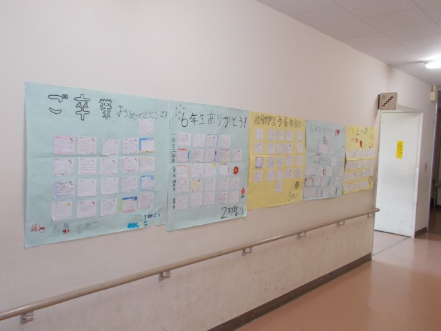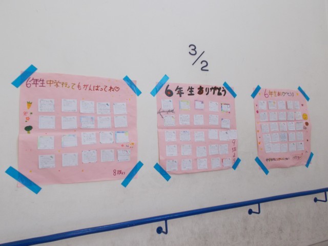 先日「学校日記」でも紹介した“最後のたてわり班活動”で6年生に渡された下級生からのメッセージが、校内に掲示されています。登校時や教室移動の際、6年生が立ち止まって見ている姿が見られます。今日を含めて6年生が登校するのは、残り4日となりました。明日の午後には、卒業式の予行練習も行われます。6年生には、下級生の想いも受け止めつつ最後まで全力で卒業式練習に取り組んでもらいたいです。