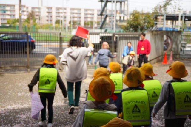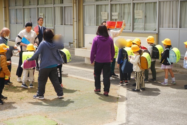 下校は、色別のコースごとに教員が引率しながら行っています。校庭に出て、名簿を使い最終確認をしてから学校の門を出ました。確認を行っている間も子供たちはその場を離れることなく待つことができていました。