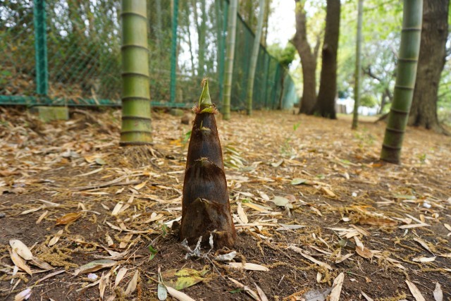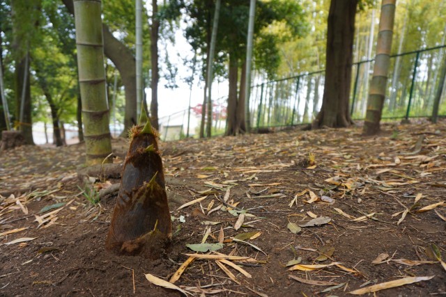 そこで、思わぬものを発見!写真にあるような「竹の子」が地面から顔を出しているではありませんか!写真に収めた2つは、一番成長が早いものですが、よく周りを見てみるとあちらこちらに竹の子の頭が見えていました。数えてみると約20本ほどありました。例年もう少し後になってから目にするきぼうの森の竹の子。今年は成長が早いように感じます。竹の子はあっという間にみるみる成長します。竹の子のように子供たちもスクスク成長してもらいたいもです。