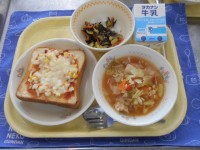 12月12日のメニュー…牛乳、ポテトピザトースト、青大豆とひじきのサラダ、パスタ...