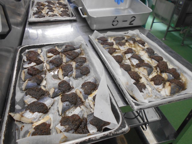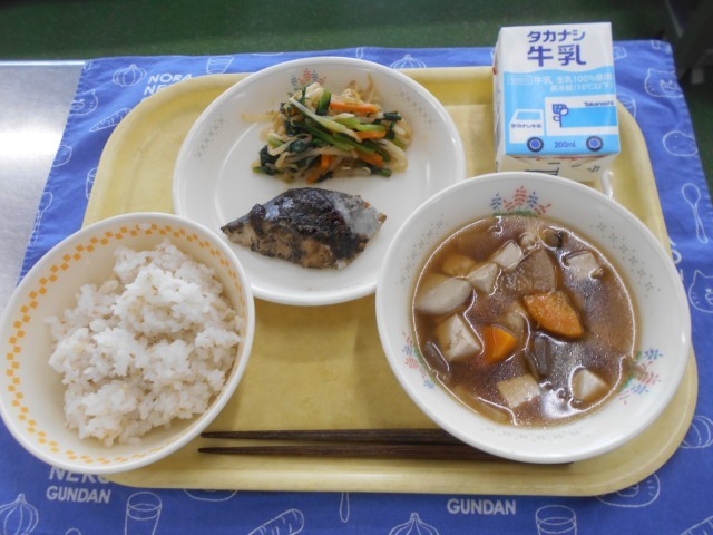 9月18日のメニュー…牛乳、玄米入りごはん、魚のゴマみそ焼き、野菜のからし和え、けんちん汁
