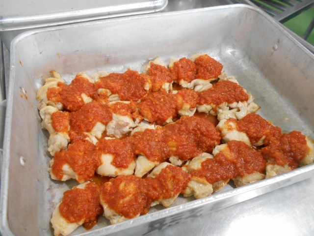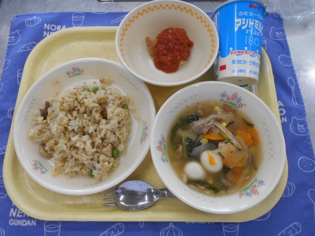 9月19日のメニュー…飲むヨーグルト、きのこピラフ、鶏肉のガーリックトマトソース、東京産冬瓜と小松菜のコンソメスープ