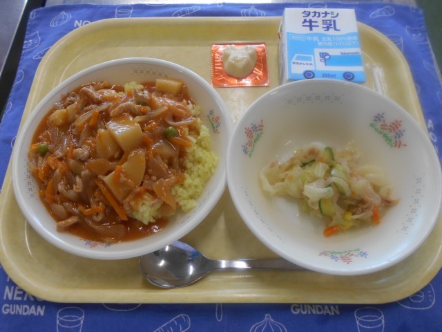 9月24日のメニュー…牛乳、ハッシュドポーク・ターメリックライス、ツナドレッシングサラダ、型抜きチーズ