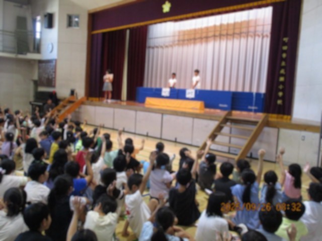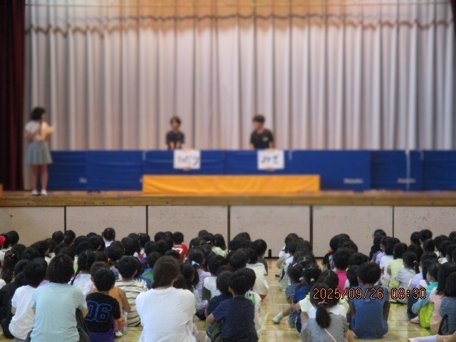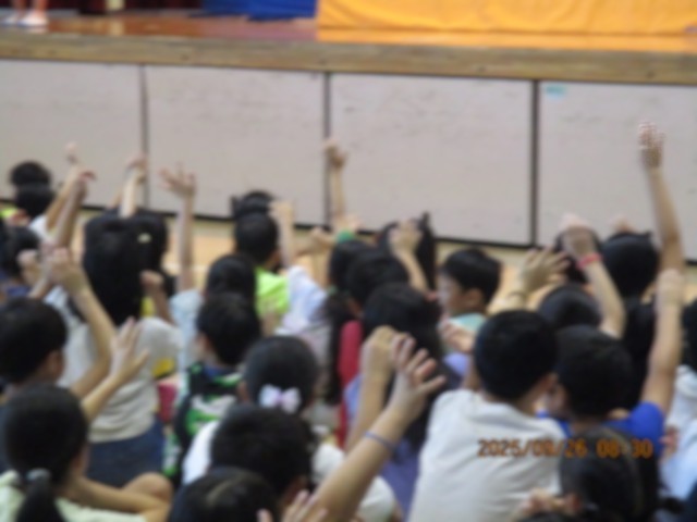 ゲーム集会の様子 公開日 2025/09/26 更新日 2025/09/26 学校日記 朝の集会は集会委員によるゲーム集会が開かれました。 全児童が体育館に集まりゲームが始まりました。 司会者のクエスチョンに、みんな楽しそうに手を挙げて答えていました。