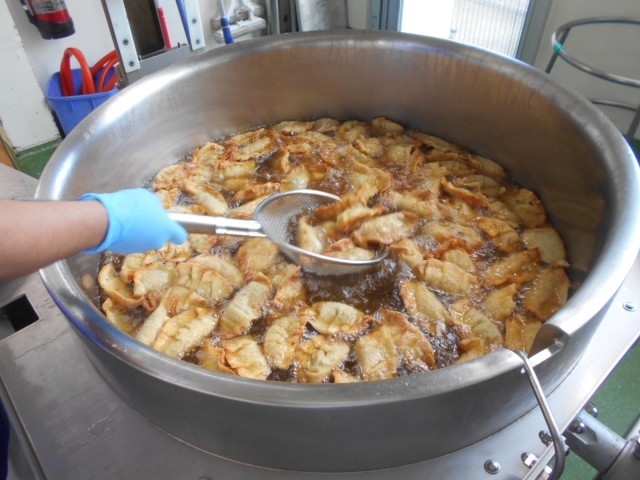 給食では大きめの皮を使って、ジャンボぎょうざを作りました。ひだは5つになるように、調理員さんに協力してもらいました。
