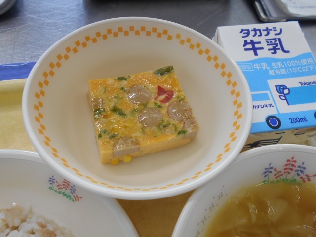 10月6日のメニュー…牛乳、ツナときのこのピラフ、スペイン風オムレツ、まめまめスープ