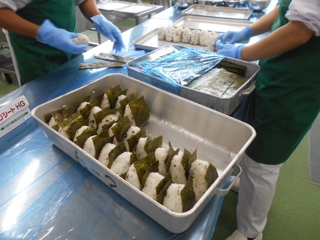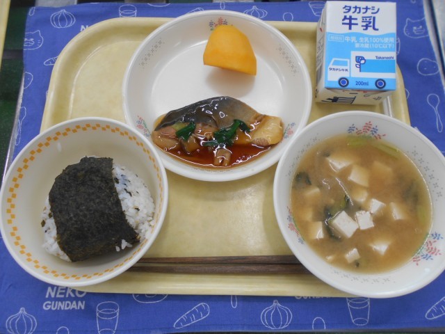 10月7日のメニュー…牛乳、わかめおにぎり、さけのきりみのきのこあんかけ、とうふのみそ汁、くだもの(かき)