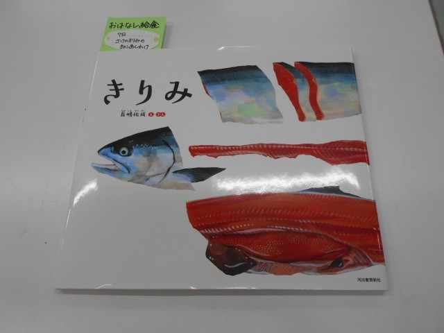 今日の絵本は「きりみ」です。このきりみ、どの部分?もとはどんな姿?さけ、まぐろ、タコからかつ節まで、いろいろな魚の切り身の姿が美しく描かれています。本日の給食では「さけのきりみ」をオーブンで焼き、うまみたっぷりのきのこあんかけをかけました。