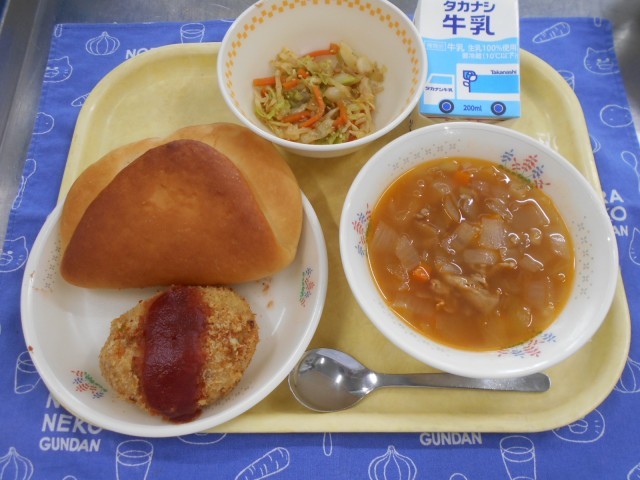 10月9日のメニュー…牛乳、ミルクパン、ぽてとむらのコロッケ、野菜のレモン風味、ミネストローネ
