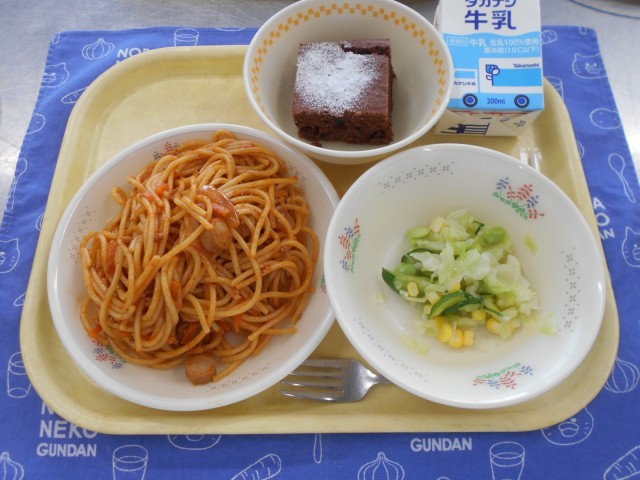 10月10日のメニュー…牛乳、ひ・る・ご・は・んの「スパゲッティナポリタン」、グリーンサラダ、高野豆腐入りチョコブラウニー