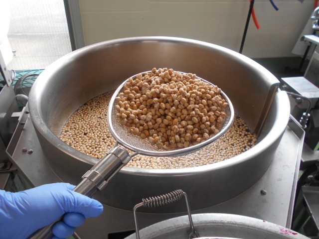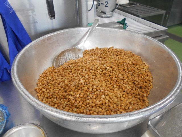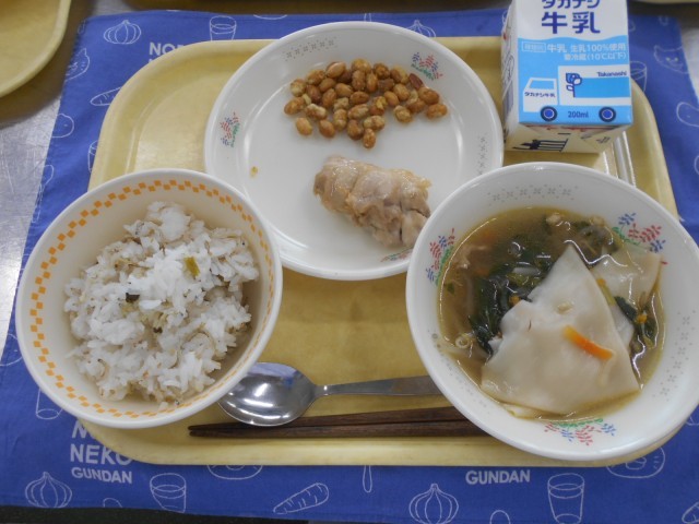 10月14日のメニュー…牛乳、じゃこと高菜のごはん、鶏肉の塩レモン焼き、ワンタンスープ、カレービーンズ