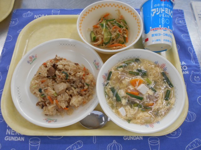 10月16日のメニュー…乳酸菌飲料、菜飯(サイファン)、春雨サラダ、にらたまスープ