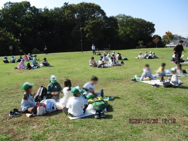 お弁当を芝生の広場でグループ毎に輪になって食べ、その後先生と一緒にゲームをしました。 青天の下、笑い声が響きみんな仲良く楽しい時間を過ごしました。