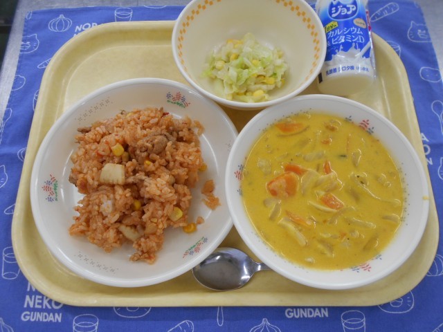 10月31日のメニュー…ジョア、ジャンバラヤ、コーンサラダ、かぼちゃスープ