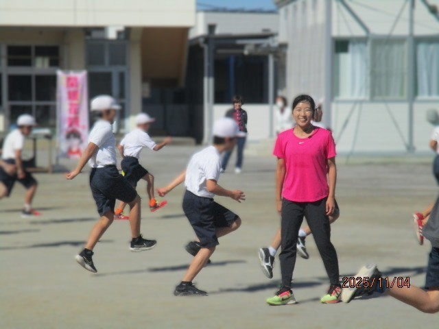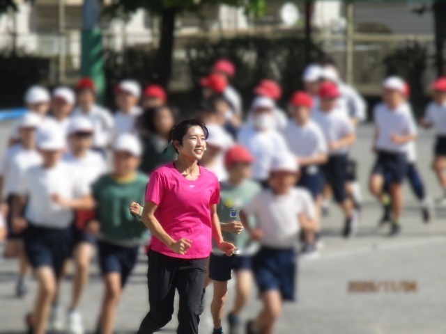 5年生6年生のランニングクリニック 公開日 2025/11/05 更新日 2025/11/04 学校日記 2016年リオデジャネイロ五輪女子1000M日本代表の関根花観さんが来校し、5年生と6年生が授業を受けました。 教室で関根さんからご自身のお話として、いつもくじけず前向きに挑戦して行く事が重要だというお話を聞きました。 その後校庭に出て準備運動をした後、走り方を教わりました。 児童はアスリートの話を真剣に聞いて、秋晴れの空の下で体を動かしました。