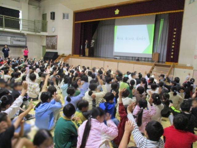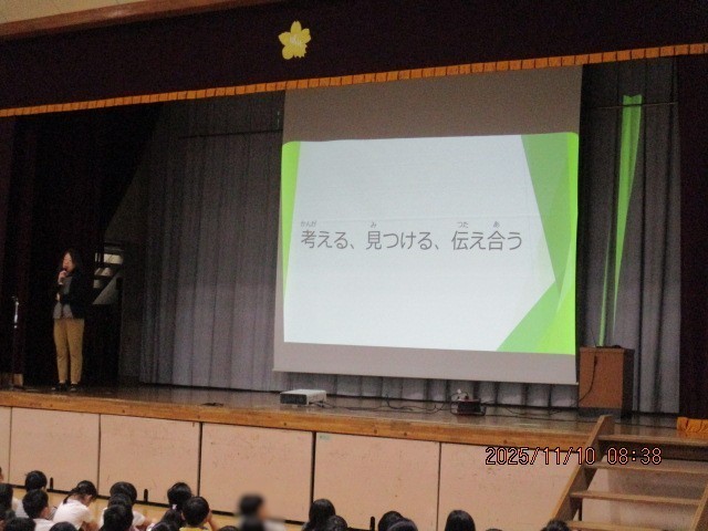 今日の全校朝会の様子です。 最初に校長先生から「遠足は天気にも恵まれて、上級生が下級生のめんどうを良く見て楽しい遠足になりましたね。」とお話がありました。 続けてスクリーンに映し出された映像を見ながら「今日は3つのお話があります。 まず相手の気持ちを考えるということです、相手が嫌がることをしない。相手の良いところを見つける。良いところを見つけたらそれを相手に伝える。ということです。 それから挨拶はとても大切です、相手の目を見て挨拶をしましょう。」 とお話があり、児童は一つ一つ「はい!」と声を出して返事をしていました。