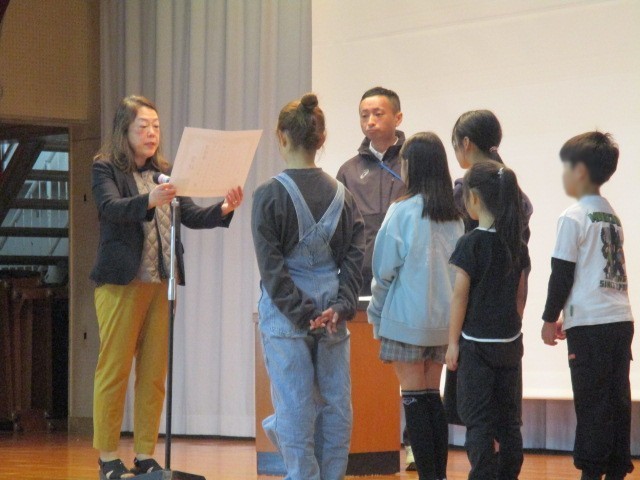 最後に、市民スポーツ大会のバレーボールで好成績を上げた児童の表彰が行われました。