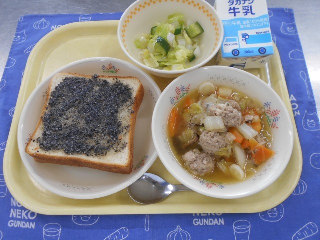 11月6日のメニュー…牛乳、セサミトースト、カントリーサラダ、白菜と肉だんごのスープ