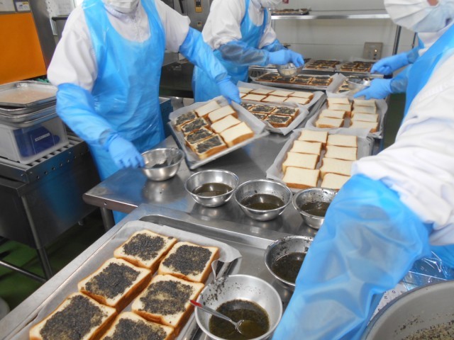 きょうは新メニューの「セサミトースト」を作りました。黒すりごま、砂糖、溶かしたバターをよく混ぜ合わせ、食パン1枚1枚に塗ってオーブンで香ばしく焼き上げます。