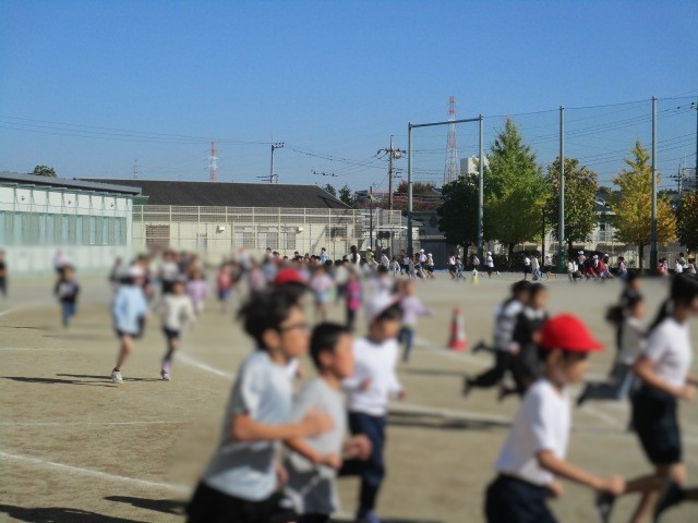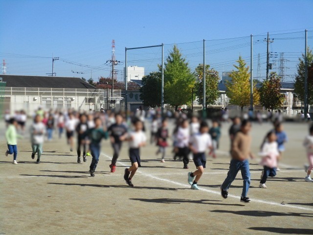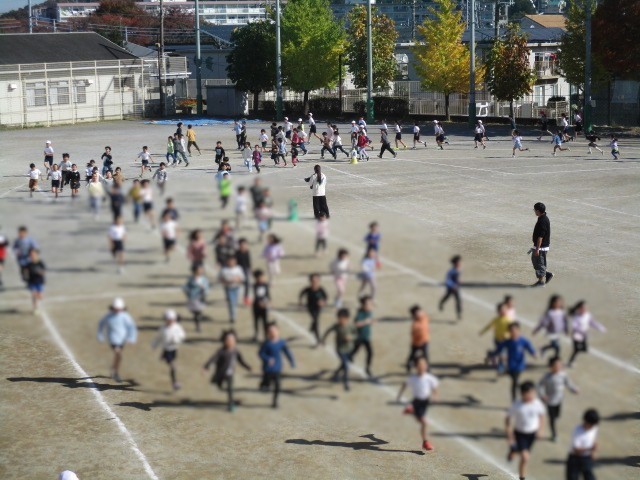 冬を予感させる寒空の下で、今日も児童は元気に走っています。 今日は1年生、3年生、5年生が中休みに校庭を走りました。