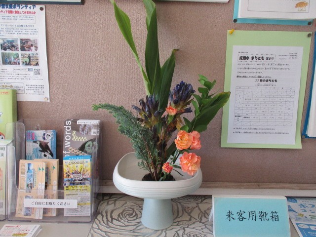 1枚目は児童が校長室の前のコーナーに可愛い、秋らしい装飾をしてくれた写真です。 また玄関、廊下にはいつもボランティアの方が季節季節の花を活けて下さっています。 児童もボランティアの方々も学校の美化への気遣い有難うございます。 校内に季節が感じられて和やかに過ごすことが出来ます。