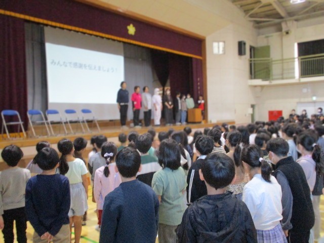 勤労感謝集会 公開日 2025/12/02 更新日 2025/11/28 学校日記 今朝は集会委員の司会で、事務さん・用務さん・調理師さん等学校を縁の下で支えて下さっている方々への、感謝を表す集会が開かれました。 児童はいつも大変お世話になっている皆さんに 「ありがとうございます!」 と声を合わせて感謝の挨拶をしました。