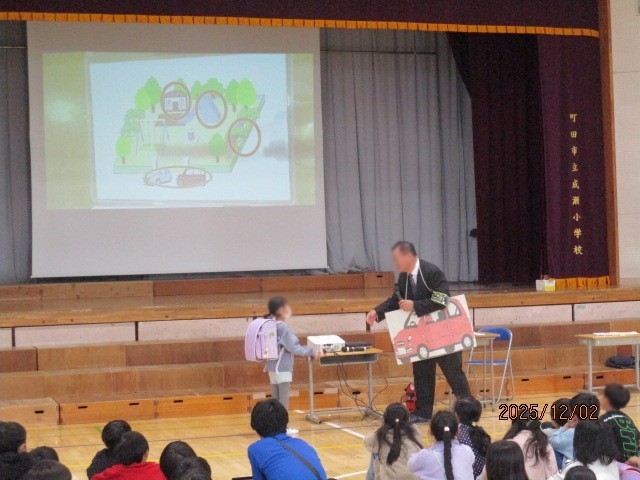 町田警察のおまわりさんが来校されて「命を守る」というテーマで講話をしてくださいました。 不審者・怪しい車に乗らない等気を付ける事、そのような場面に出くわした場合どのようにしたらよいかを、寸劇を織り込みながら分かりやすくお話をしてくださいました。