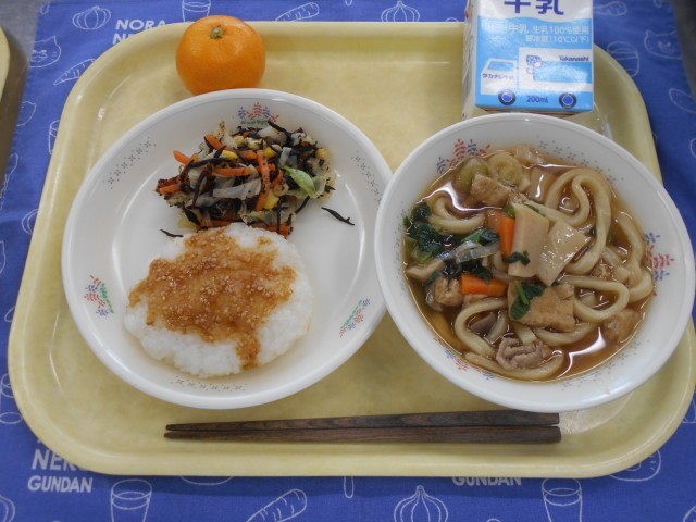 11月12日のメニュー…牛乳、秋の煮込みうどん、五平餅、ひじきと人参のサラダ、くだもの(みかん)