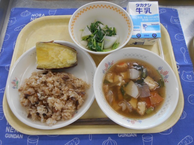 11月21日のメニュー…牛乳、さんまごはん、カブと水菜のサラダ、のっぺい汁、やきいも