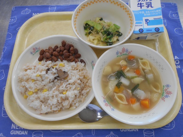 今日のスープはカブとカブの葉をたっぷり使って作りました。カブは弥生時代に中国から伝わった野菜といわれています。姿は大根に似ていますが、白菜や小松菜から分かれてできたものです。ビタミンCが豊富で風邪予防に効果があります。スープと一緒にしっかり食べましょう!