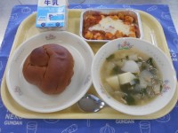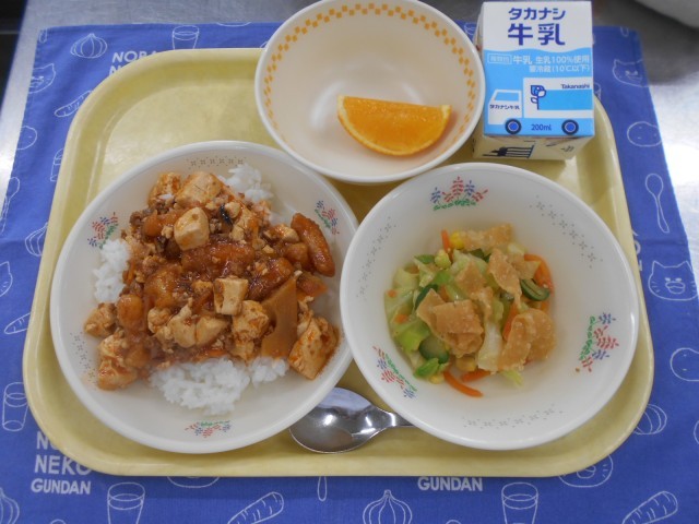 12月2日のメニュー…牛乳、豆腐とイカのチリソース丼、パリパリサラダ、紅マドンナ(柑橘)
