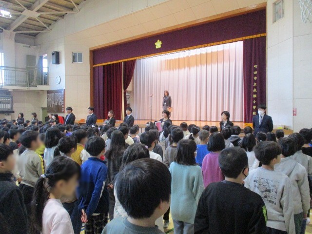 今朝の3学期の始業式の様子です。 最初に校長先生から「 今年の干支は午年です。 馬の走りのように目標を立てて真っ直ぐ進みましょう。 そして感謝の気持ちを持ちましょう、今日安全委員の方が登校の時に横断歩道に立って見守ってくださいました。 きちっと挨拶はできましたか? 多くの皆さんに支えられている事に感謝しましょう。 」とお話がありました。 最後に児童代表の3年生が、それぞれの3学期の抱負を話して始業式が終わりました。