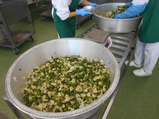 12月16日のメニュー…牛乳、わかめごはん、厚焼き卵、かぶと小松菜の昆布和え、利休汁