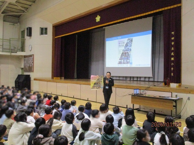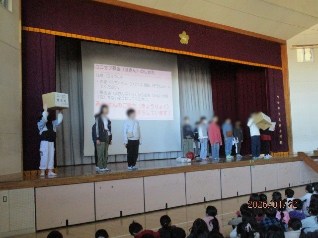 27日28日のユニセフ募金に向けて、関連するイベントが行われました。 20日にはユニセフから元全国小学校道徳教育研究会会長の金子先生が来校してユニセフについてのお話をしてくださいました。 児童にはユニセフは身近のようで、ユニセフに関するクイズに多くの児童が手を挙げて答えていました。 今日22日の朝会では代表委員会によるユニセフ集会が開かれて募金についての説明がされました。 この募金がきっと世界の恵まれない子供たちへの助けになるでしょう。