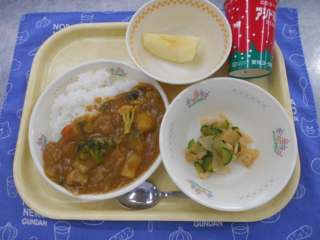 12月19日のメニュー…飲むヨーグルト、冬野菜のカレーライス、手作り福神漬け風和え物、くだもの(りんご)