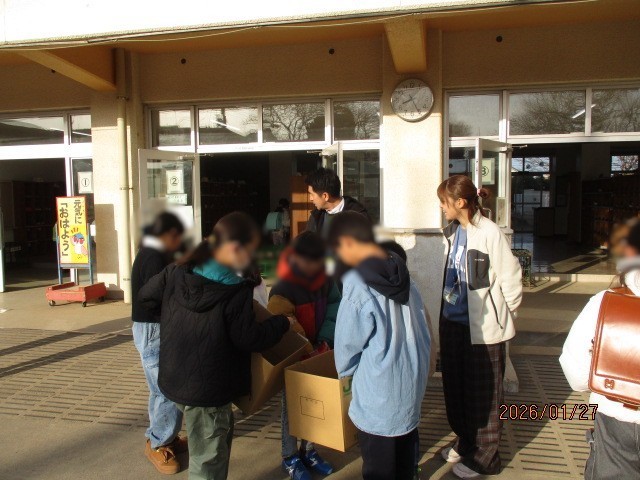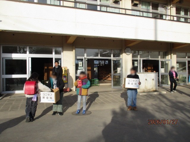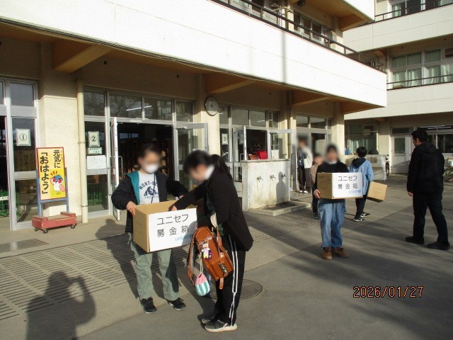 ユニセフ募金活動 公開日 2026/02/02 更新日 2026/01/29 学校日記 ユニセフ募金が今日と明日で朝の昇降口前で始まりました。 代表委員の児童が 募金箱を持って「 おはようございます! 募金をお願いしま~す! 」と登校してくる児童に大きな声で呼びかけをしていました。 3枚目の写真は最期に、先生と一緒に集まった募金を整理しているところです。