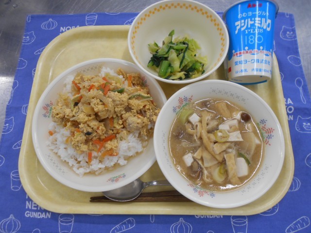1月20日のメニュー…飲むヨーグルト(アシドミルク)、親子丼、なめこのみそ汁、小松菜のじゃこ和え